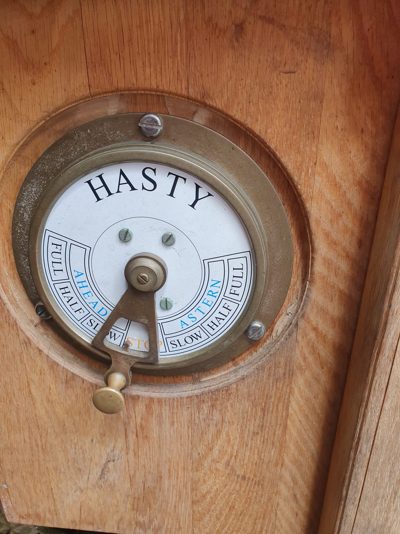 Something I hadn’t realised is that cruising a steam boat is a two-man job, at least. While Andy takes care of steering at the tiller, Keith is busy inside the engine room making the engine do what is needed. Andy communicates with Keith using Hasty’s superb telegraph, which tells Keith if forward or reverse is needed, and how much power is required.