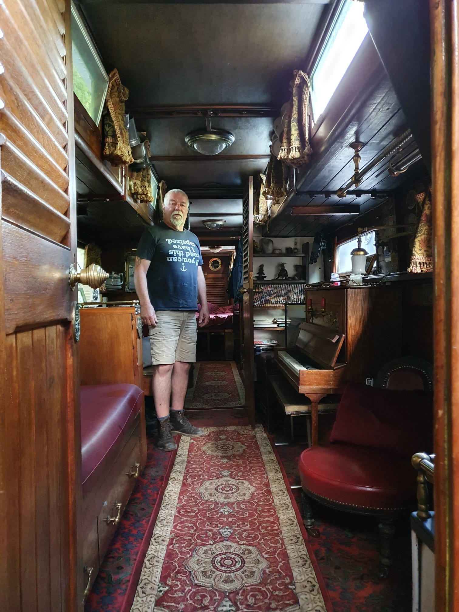 The interior of the boat is a sight to behold and is a real timewarp. Along with the antique brass, crockery and a whole host of other narrowboat memorabilia, there’s even an old piano which has been aboard since Elizabeth was converted. Martin’s plan is to tackle the outside of the boat next and bring that up to a similarly impressive level of restoration.